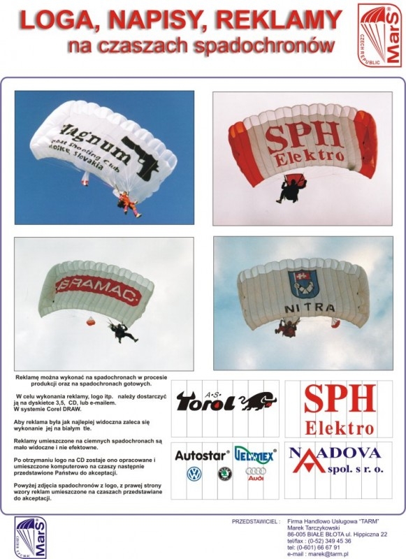 Reklamę można umieścić na spadochronach w procesie produkcji oraz na spadochronach gotowych.